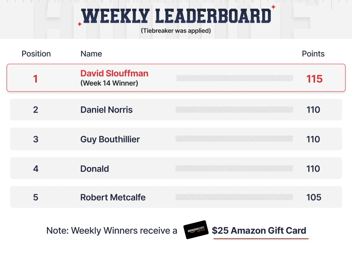 As for the rest of you, the challenge is far from over. Week 15 is right around the corner, and every pick is an opportunity to make your way up the leaderboard.